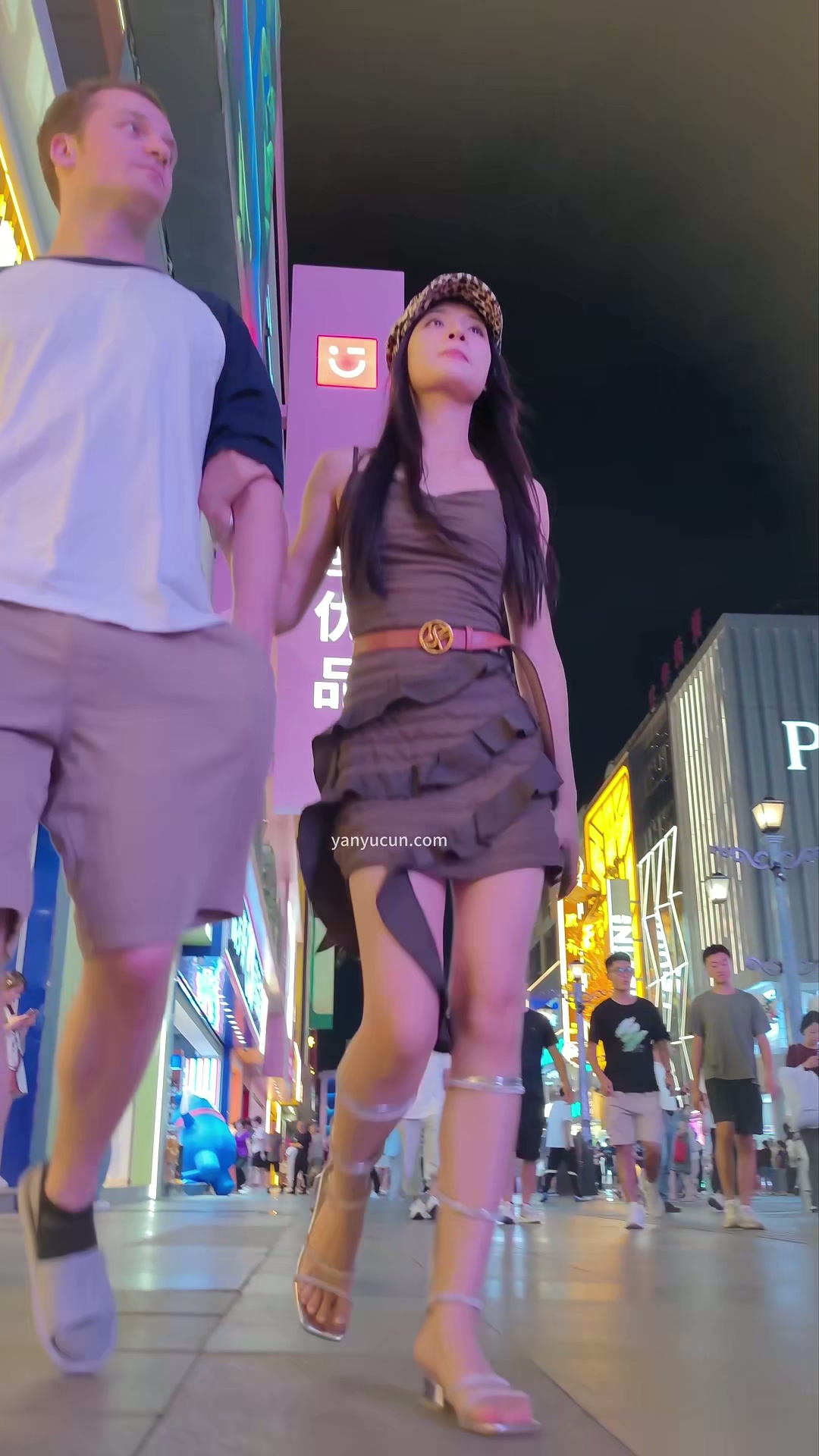 XM339灰色超短裙美女和外国男朋友逛街,豹纹窄内 339